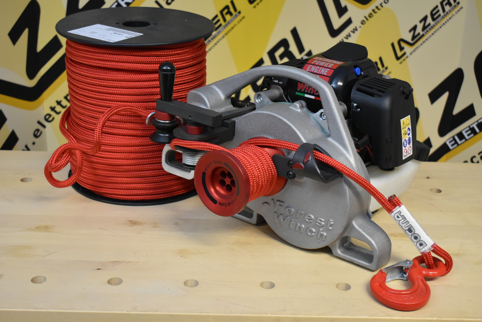 Verricello Forestale DOCMA VF105 RED IRON. Questa versione include 100mt.di fune alta resistenza Ø 10mm con gancio, carrucola rinvio, grillo alta resistenza, fune tonda da imbrago e fascia ancoraggio con cricchetto. Tutto in dotazione in questa versione "SPECIAL" FORESTA