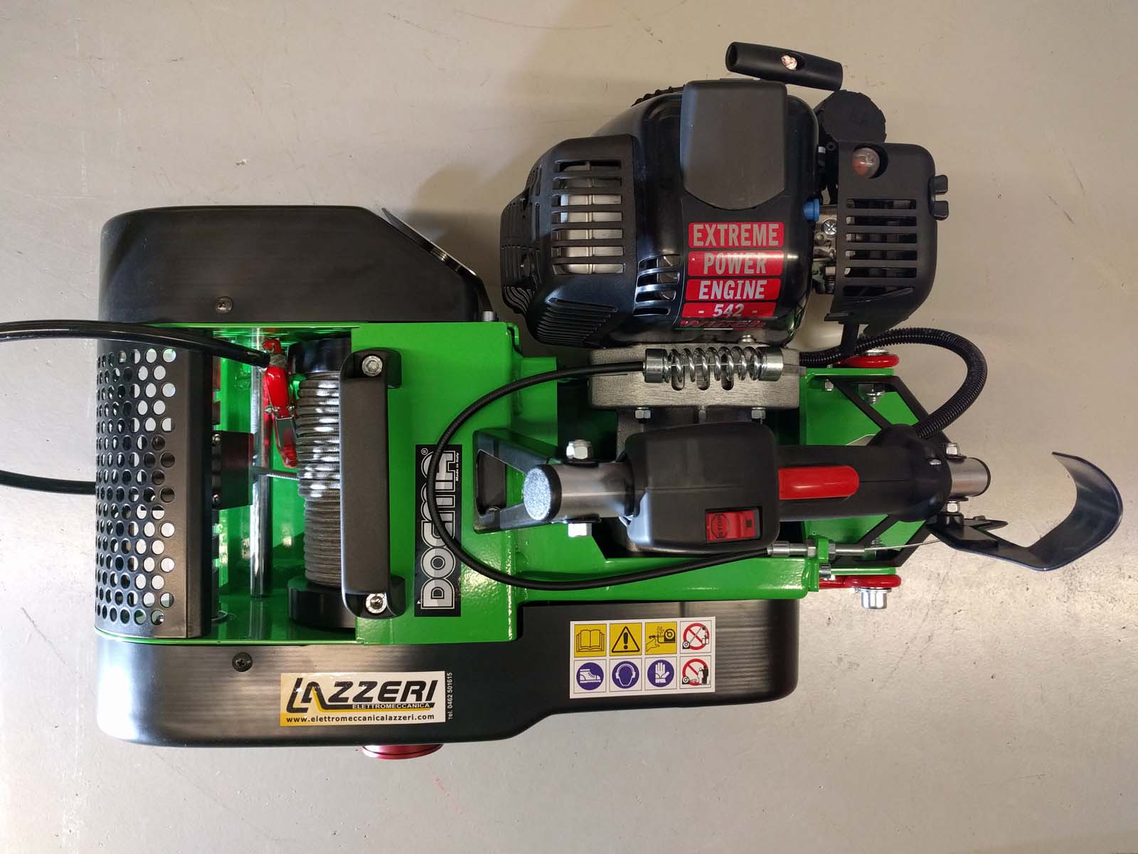 Grande attenzione e stata data anche al sistema di innesto/disinnesto trazione, molto solida ed estiticamente piacevole e la manopola di manovra, facile da manovrare anche con i guanti di protezione indossati Come su tutti i verricelli della gamma Forestwinch di DOCMA anche sul VF155Automatic è montato il potente motore a 2 tempi di produzione made in Germany SOLO di 54.20 CC, solido e allo stesso tempo semplice da mettere in moto e inoltre non richiede particolari interventi di manutenzione o carburazione. In questa immagine si può notare il sistema guida fune del Verricello DOCMA VF155 in versione AUTOMATIC, questo dispositivo permette di avvolgere sempre la fune in perfetto ordine onde evitare spiacevoli accumoli che potrebbero di fatto bloccare il tamburo del cordino in fase di avvolgimento.Questo sistema comunque non sostituisce l'indispensabile utilizzo della carrucola di rinvio.